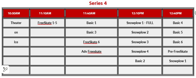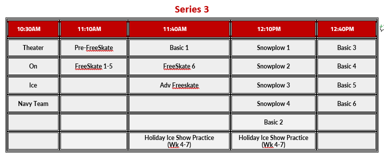 The Program follows the curriculum developed by Learn To Skate USA. It is designed to take skaters from beginning steps through advanced classes.